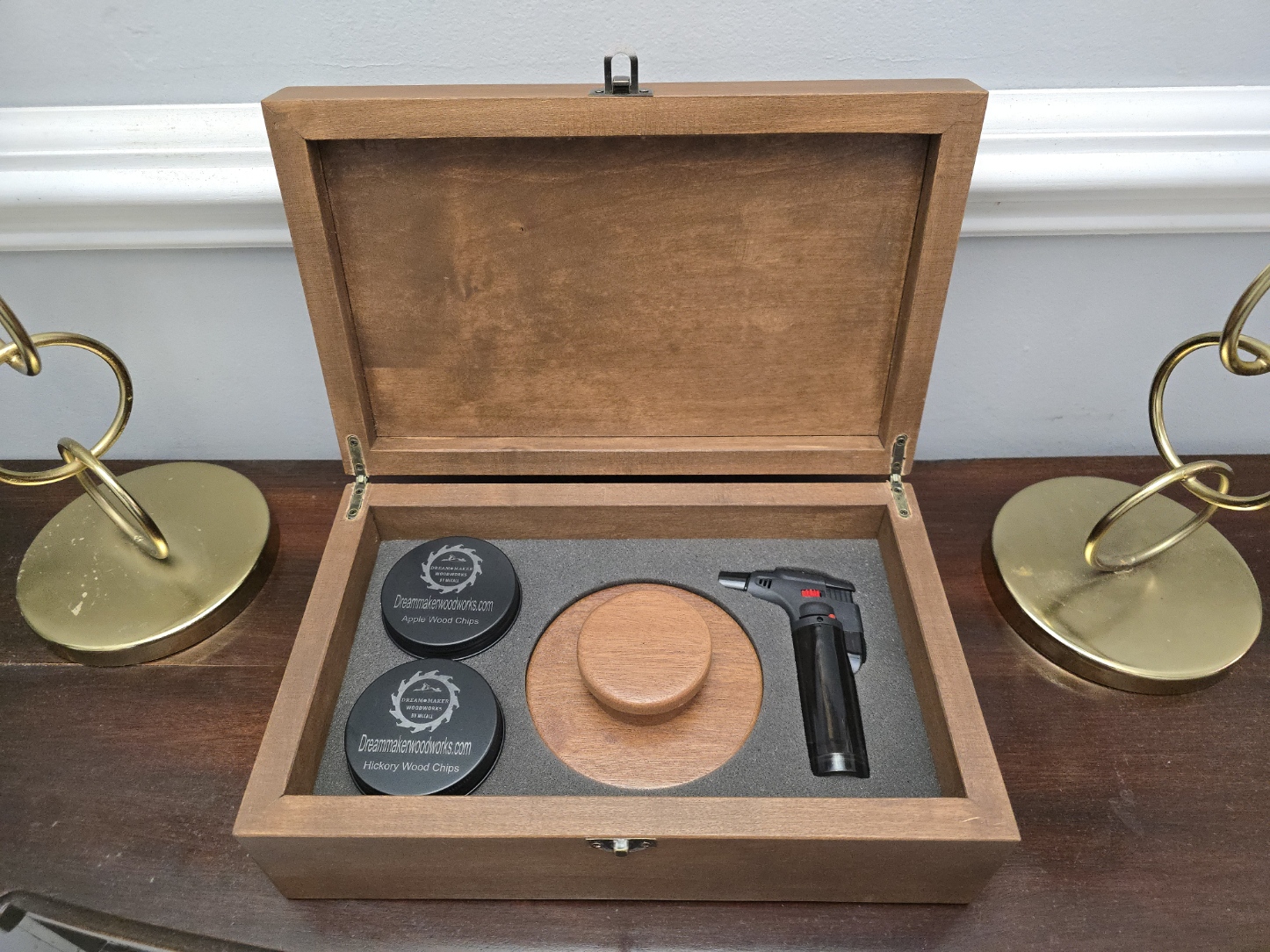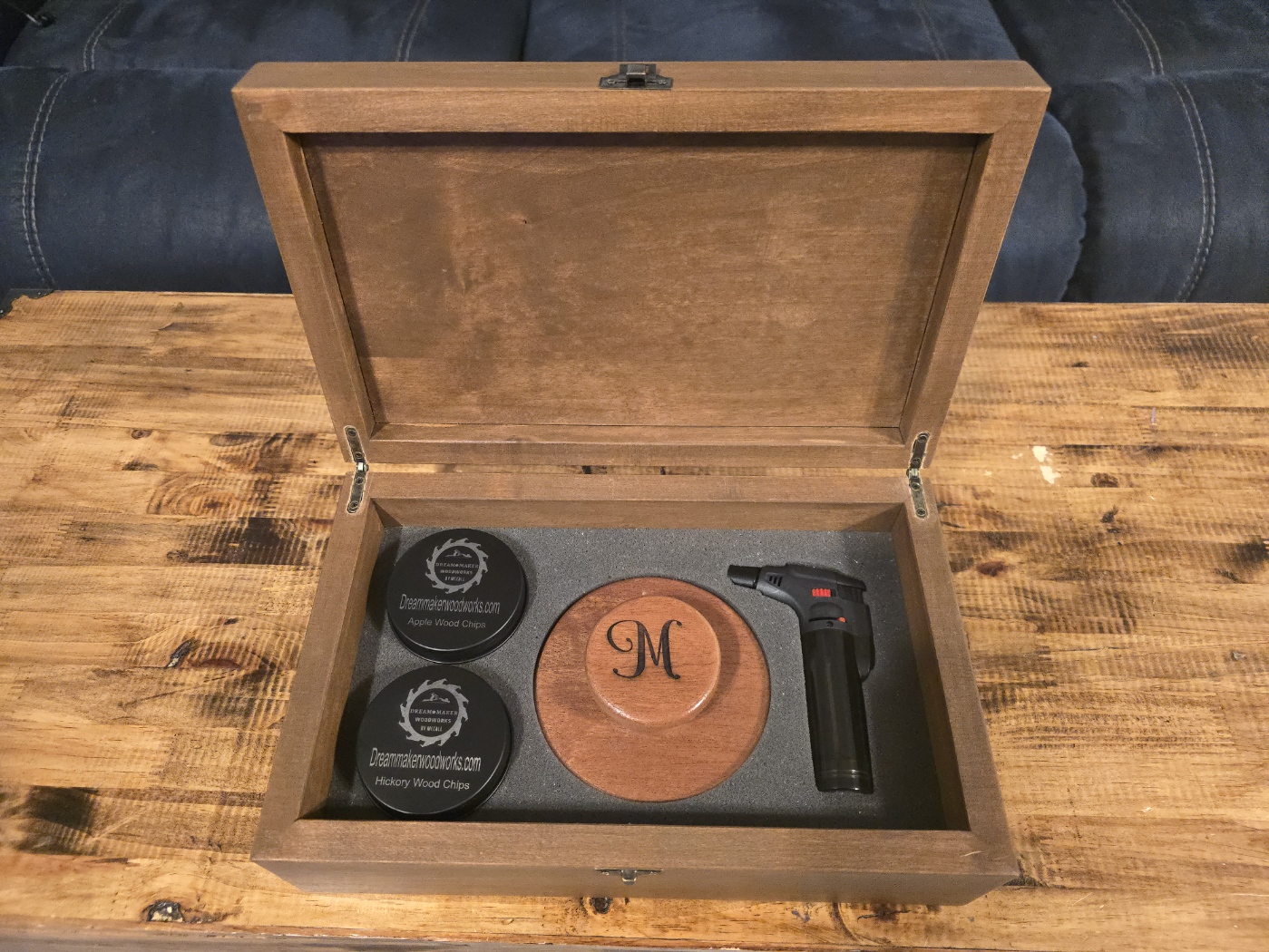 Whether you are just relaxing at home or on the go spending time with friends, take your cocktails to the next lever with this hand-crafted made in American cocktail smoke infuser. Our cocktail smoke infusers are designed to release the rich smoky flavor that only a quality smoker can provide. Our Cocktail Smoker Kits are 100% hand make not from a production factory and can be personalized adding that personal touch for you or as a gift. The Cocktail Smoker Kit comes with smoke infuser, torch lighter, two containers of wood chips (Apple, Hickory) to get you started all in a hand-made wooden carrying case. Especially suitable as Birthday, Valentine's Day, Father's Day, Anniversary, Christmas, New Year or cocktail lovers gift.